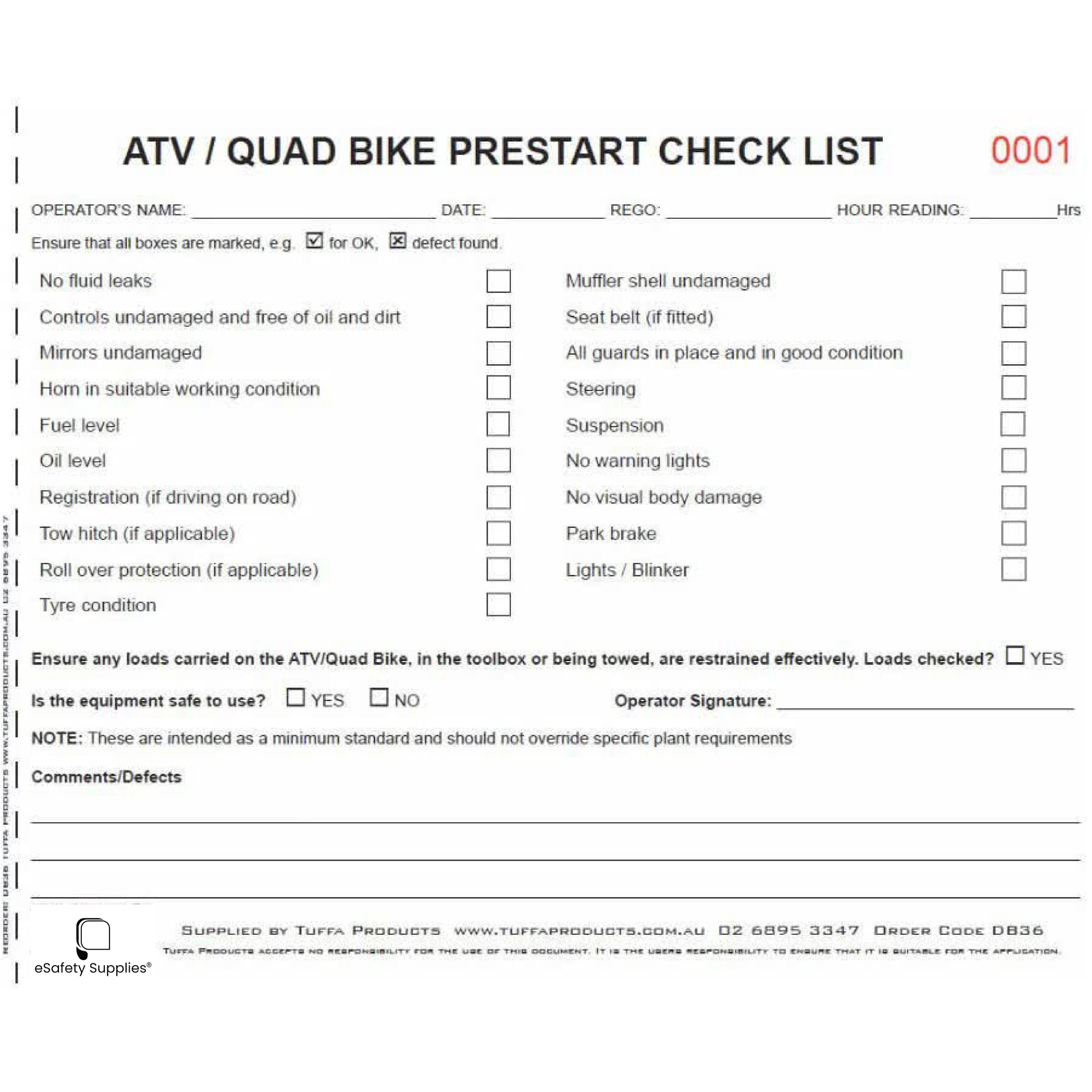 ATV / Quad Bike Prestart Checklist Books