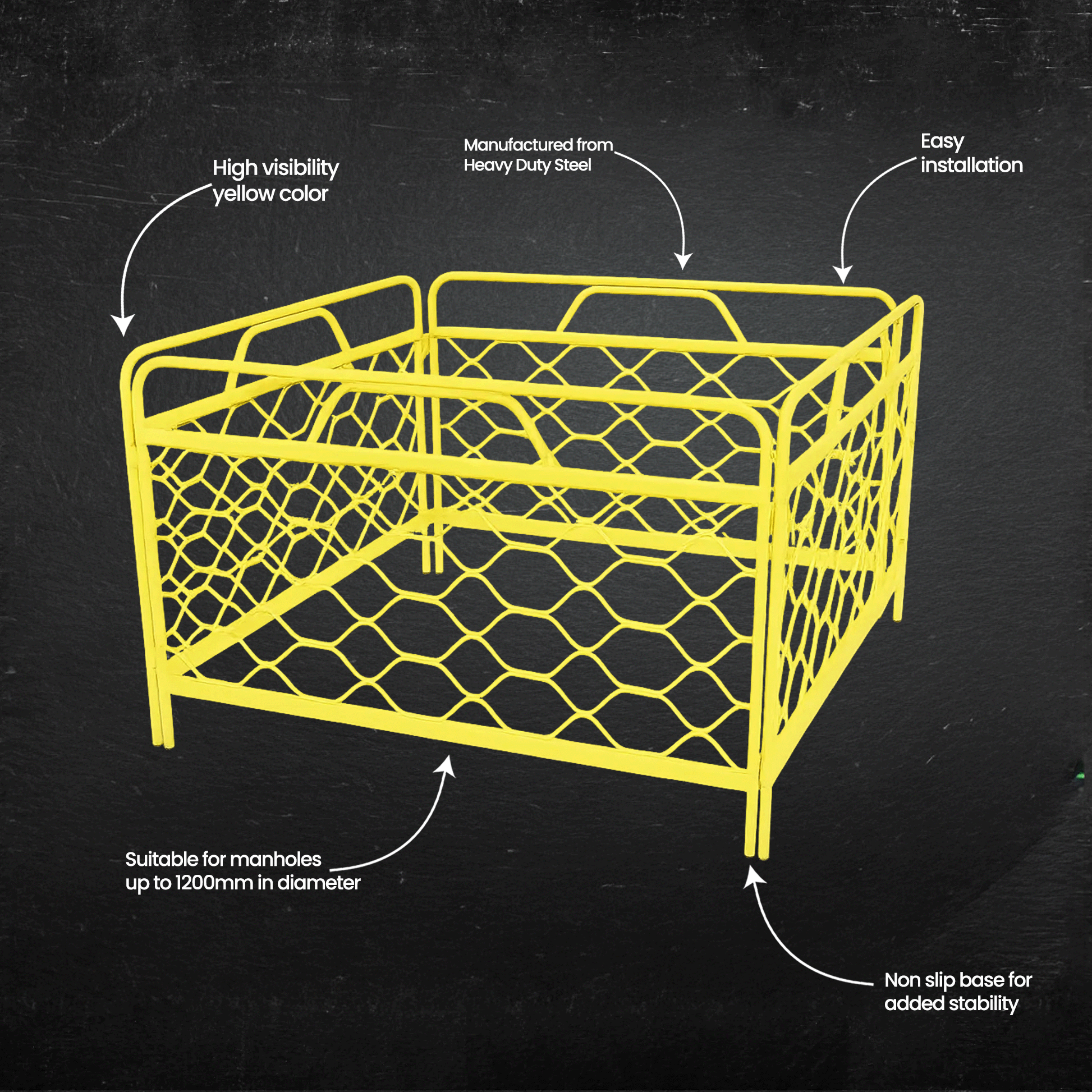 The Manhole Pit Guard is a sturdy and durable safety device designed to prevent accidental falls into open manholes or utility pits. Made from high-quality materials, it features a secure frame and a protective cover that fits snugly over the opening. With its easy installation, high visibility, and compliance with safety regulations, this guard ensures a safer work environment on construction sites, roadworks, and other areas with potential hazards.